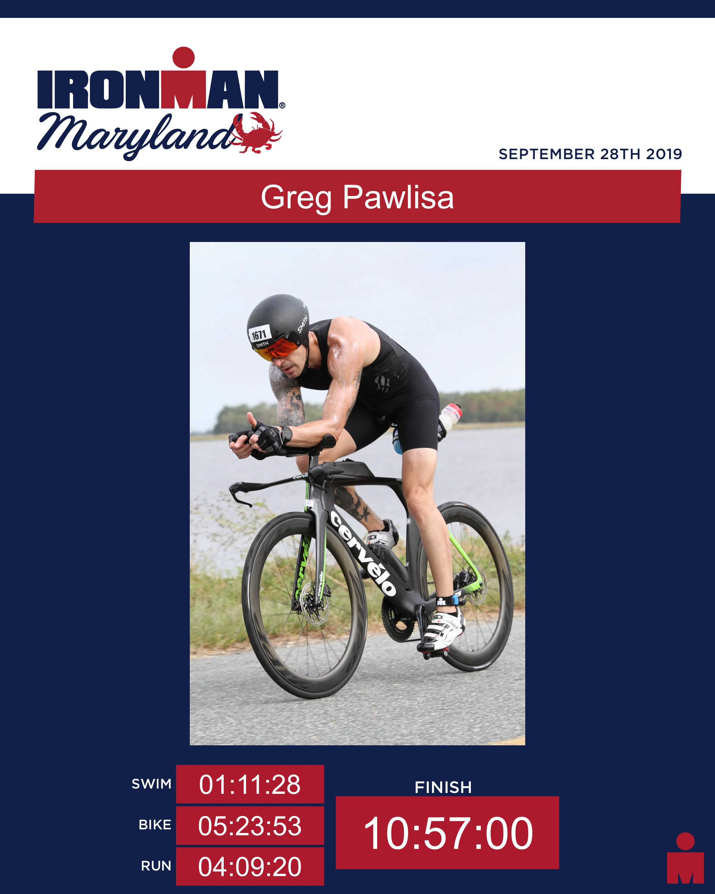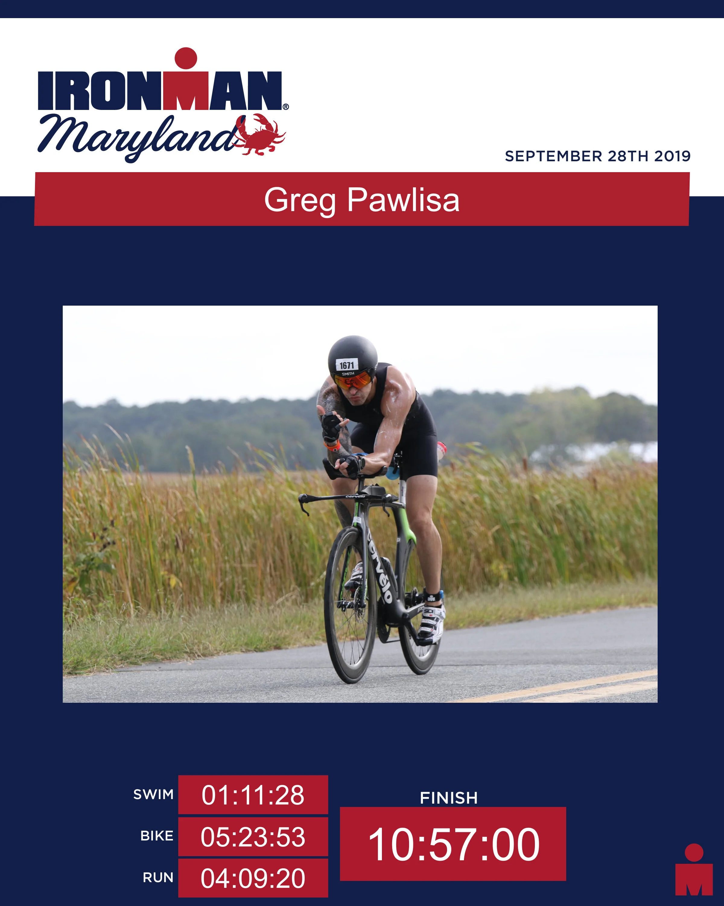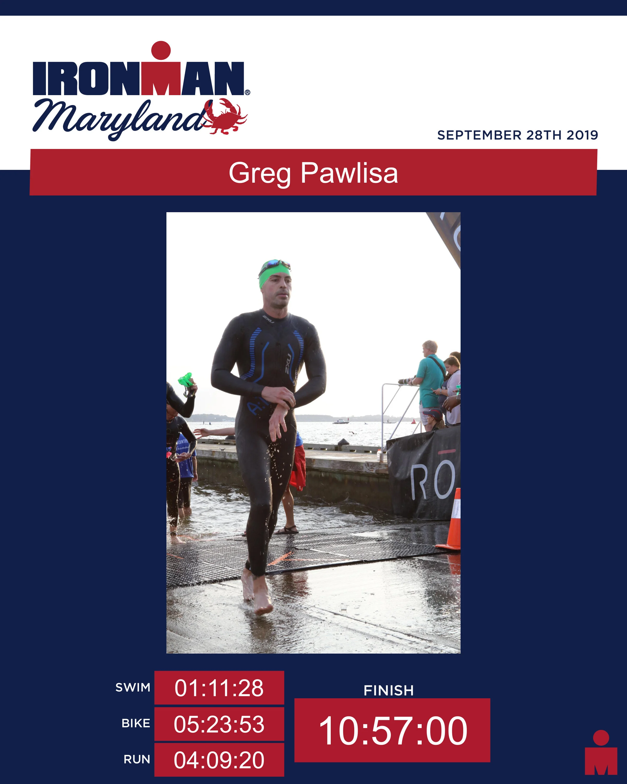 I can see the finish line now and hear the names being called out as they cross the finish line. I’m only .2 miles away and all the training, sacrifice, discipline have all been leading up to this. A goal that was set over 1 year ago! The song “My Hero” by The Foo Fighters is playing as I run down the red carpet covered with the famous M-Dot Ironman logo…its so fitting. This is about to be the biggest, most rewarding moment of my life and I have a soundtrack from my youth….perfect! I’m feeling it all now, 12 months of training and emotions all come out of me as I cross the finish line and hear my name announced, “41 years old, from New York, NY, Greg Pawlisa, YOU ARE AN IRONMAN!” (I’m actually 40 but they always round up) I can’t hold back my tears as I see my wife and run over to hug her. We did it, I’m an IRONMAN!