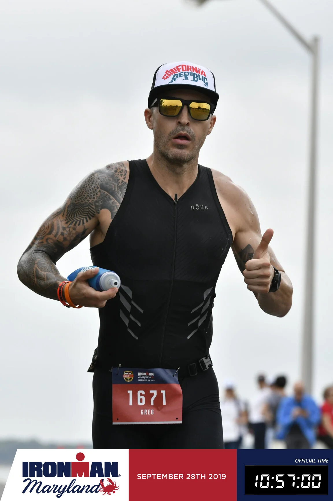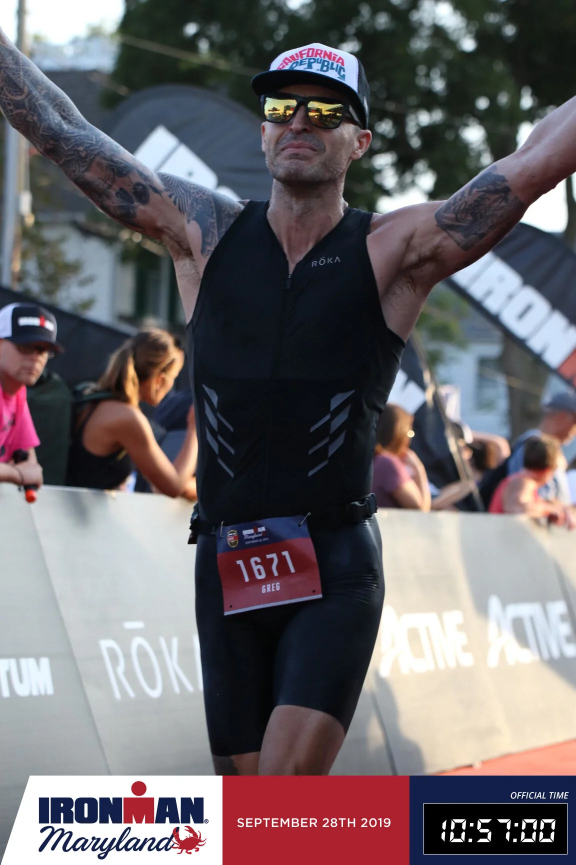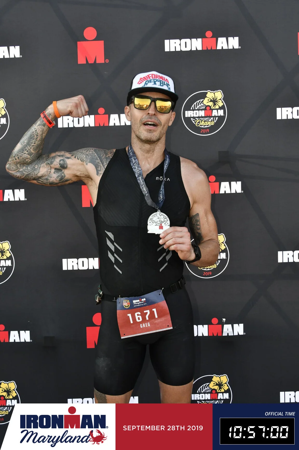 I can see the finish line now and hear the names being called out as they cross the finish line. I’m only .2 miles away and all the training, sacrifice, discipline have all been leading up to this. A goal that was set over 1 year ago! The song “My Hero” by The Foo Fighters is playing as I run down the red carpet covered with the famous M-Dot Ironman logo…its so fitting. This is about to be the biggest, most rewarding moment of my life and I have a soundtrack from my youth….perfect! I’m feeling it all now, 12 months of training and emotions all come out of me as I cross the finish line and hear my name announced, “41 years old, from New York, NY, Greg Pawlisa, YOU ARE AN IRONMAN!” (I’m actually 40 but they always round up) I can’t hold back my tears as I see my wife and run over to hug her. We did it, I’m an IRONMAN!