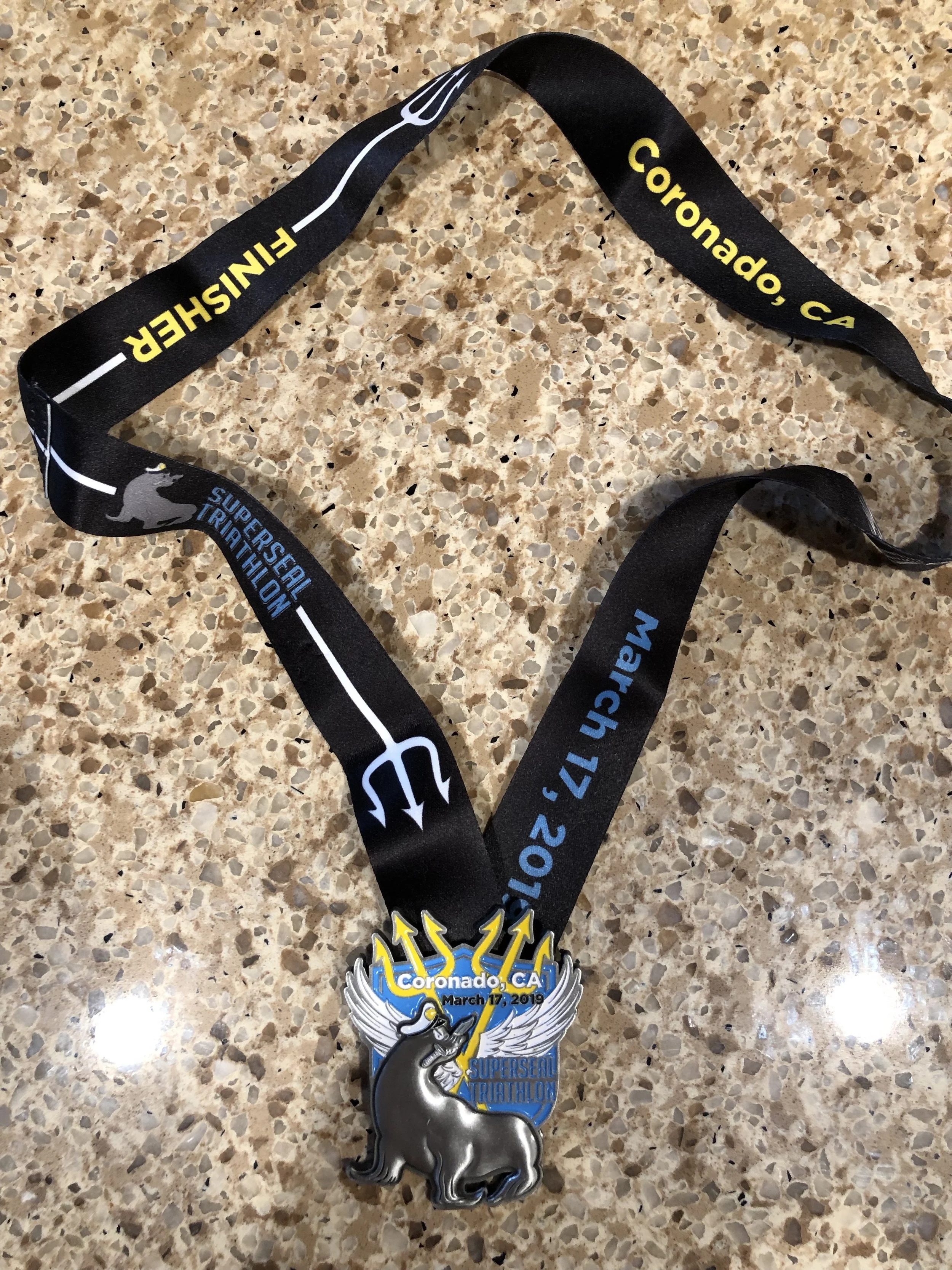 I really enjoyed this run. The run course is a 10K course on a dirt trail and will be composed of two loops. So you get out of the tunnel and back to the beach where the first 1-2 miles is a dirt trail along the bay, kinda cool. Then it pivots to pavement for the next 2 miles and you do this one more time. It’s very flat and fast. I made up a lot of ground on the run. The sun was out, so be sure to have a hat, sunglasses, and sunscreen. I crossed the finish line in just under 3hrs (not my best but a fun start to the season). The medal is really cool and honors the Navy Seals who this event helps support.